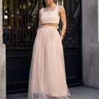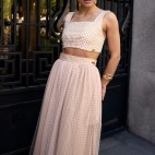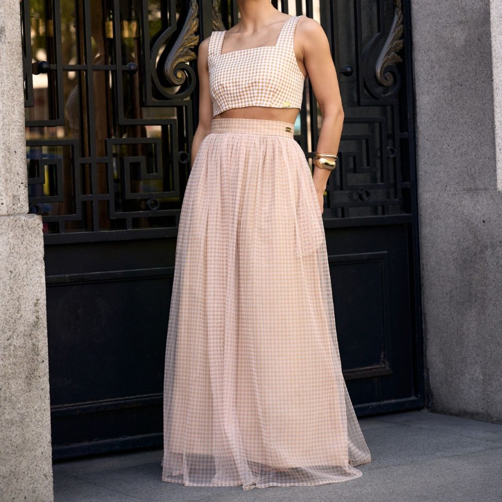Long skirt in gingham pattern with a fluid and lightweight silhouette, designed to move naturally and elegantly. The high waist enhances the figure, while the lightweight and delicately translucent fabric creates an ethereal and sophisticated effect. A piece designed for bright days, where simplicity transforms into presence.