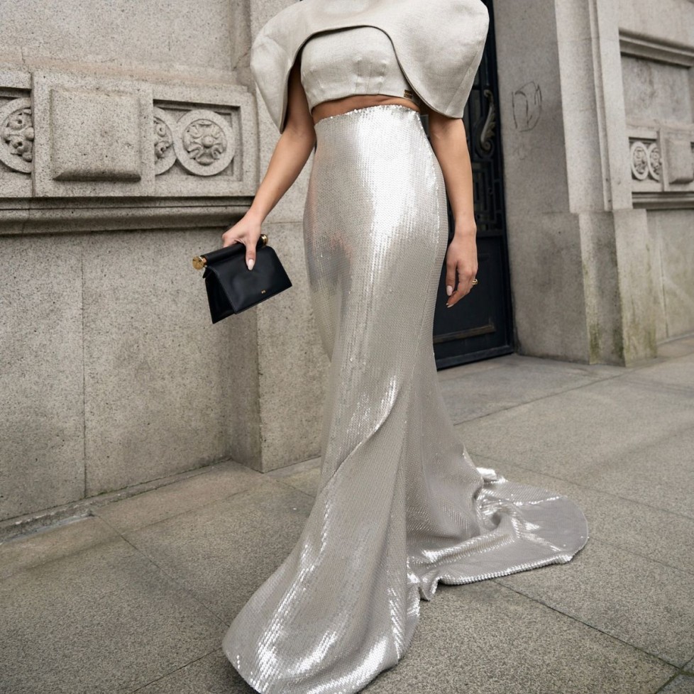 SAIA LONGA DE LANTEJOULA COM CAUDA. SILHUETA ELEGANTE, ELÁSTICO OCULTO E FORRO.