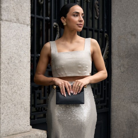 TOP COM CONSTRUÇÃO FIRME QUE DEFINE A CINTURA E CRIA VOLUME CONTROLADO PARA UMA SILHUETA ELEGANTE. CONFECIONADO EM TECIDO COM BASE TWEED COM LANTEJOULA TRANSPARENTE NA SUPERFICIE.