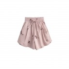 CALÇÕES COM BOLSOS, CINTURA MÉDIA E ELÁSTICA. DETALHE DE BORDADO EM FLOR DE LANTEJOULA E VIVOS COM COR EM CONTRASTE.